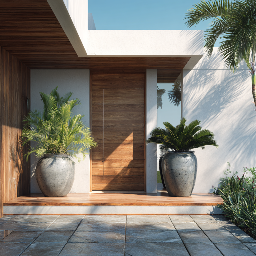 Entrada de casa moderna em Cuiabá com par de vasos vietnamitas contendo Palmeira Fênix saudável e verde sob luz solar.Como identificar a sede real da planta?
